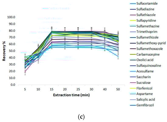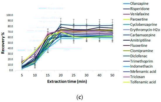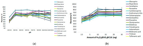 The adsorbent amount was also investigated. Different amounts of the MNPs—C18 from 2.5 to 30 mg—were tested to optimize the amount of sorbent. As can be seen in the extraction efficiency profile shown in Figure 8b, the mean recovery for all the analytes increased with an increase in the amount of sorbent from 10 to 30 mg, while mefenamic acid kept a stable trend and thereafter leveled off. This could be explained by the fact that by increasing the amount of sorbent, the area required for the adsorption of the analytes is increased as well, up to a certain level. As can be deduced from Figure 8b, the application of 10 mg sorbent provided the most satisfactory recoveries for all the analytes. Therefore, 10 mg was the optimum amount and was used for the next experiments.