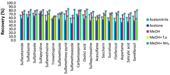 The results in Figure 6 show that the efficiency of MSPE reached a maximum when methanol was used as the elution solvent under the same extraction and desorption conditions. To increase the desorption efficiency, taking into consideration the pH sorbent dependence, formic acid or ammonia was added at various percentages (1–5% v/v) to increase the acidity or alkalinity. The addition of formic acid (f.a) was not more efficient than pure methanol in most of the compounds, while on the other hand, the addition of ammonia significantly increased the recoveries of the extraction. This is reasonable and in accordance with the results from the pH optimization of sorption process, as well as with the physicochemical properties (PKa, logD) of the compounds, since it was found that an alkaline environment does not favor the sorption, resulting in an increase in the desorption efficiency. The effect of ammonia percentage in methanol was also studied in the range of 0–5% (v/v). The result indicated that the desorption efficiency of methanol containing 1% ammonia was superior to pure methanol. When increasing the percentage of ammonia more than 1%, the extraction recoveries of SAs decreased slightly. This is probably because SAs will be less positively charged in an alkaline medium, resulting in weakening the affinity with the sorbent [28]. Thus, methanol containing 1% ammonia (v/v) was selected as the optimum elution solvent.