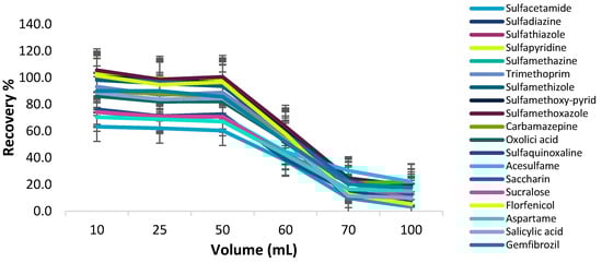 To obtain the maximal extraction efficiency and lower MQLs the effect of the sample volume on the extraction efficiency was examined under the optimal conditions (10 mg of adsorbent, pH 3.0, 15 min of extraction time, 2 mL of methanol containing 1% NH3, and 60 s sonication twice). The different sample volumes (10–100 mL) investigated contained 1 μg of the target analytes. As shown in Figure 7, the target analytes provided satisfactory recoveries in a sample volume from 10.0 to 50.0 mL; however, when the sample volume was above 50 mL, the extraction efficiency was reduced significantly. This may occur since a larger sample volume results in more adsorbent loss during the recovery process. Consequently, 50 mL of sample solution volume was selected.