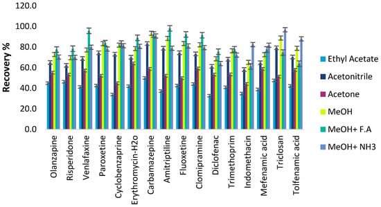 A suitable desorbing solvent should effectively elute the adsorbed analytes with the minimum volume without damaging the nature of the adsorbent surface and with fewer interfering impurities coeluted. Several eluents, such as acetonitrile, methanol, acetone, and ethyl acetate, were evaluated to select the best eluent solvent for eluting the pharmaceutical compounds from the C18-MNPs. Their recovery efficiencies were evaluated under the same extraction and elution conditions and are depicted in Figure 9. Methanol exhibited the highest recoveries and the acidity or alkalinity in desorption solvent was further evaluated with the addition of formic acid and ammonium hydroxide solution in various concentrations (0–5% v/v). The results indicate that methanol acidified with 1.0% v/v formic acid (f.a) provided the highest elution capability for all the compounds in comparison with other solvents. Most analytes are in an ionic state in acidic FA solution, so reduced interaction occurs with non-polar C18 groups. Therefore, methanol containing 1% v/v f.a was chosen as the elution solvent.