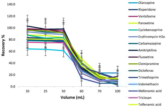 The possibility of enriching low concentrations of the target analytes from large volumes of the samples was examined by studying the effect of sample volume on the recovery of the analytes. The sample solution volume effect was assessed by treating 15 mg magnetic C18 nanoparticles with different sample volumes (10–100 mL) of the standard solutions, each of them containing 1 μg of analytes. As shown in Figure 10, quantitative recoveries of the target analytes were obtained with up to 50 mL of the sample solution, while above 50 mL the recoveries decreased. Hence, a sample volume of 50 mL was selected as the ideal volume for the extraction of the target analytes from C18 MNPs.