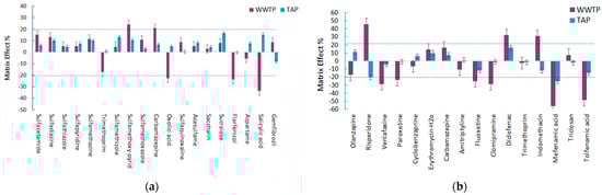 The ME was evaluated for the different aquatic matrices and the results are shown in Figure 12a,b. The ME was calculated according to Equation (1) [30,31,32].