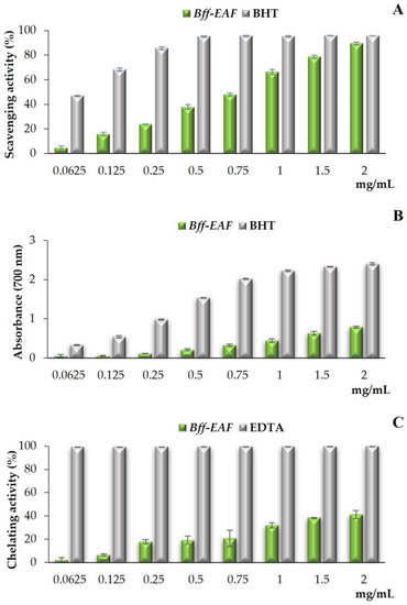 Free radical scavenging activity (DPPH test) (A), reducing power (B), and ferrous ion chelating activity (C) of Bff-EAF. Values are expressed as the mean ± SD (n = 3).