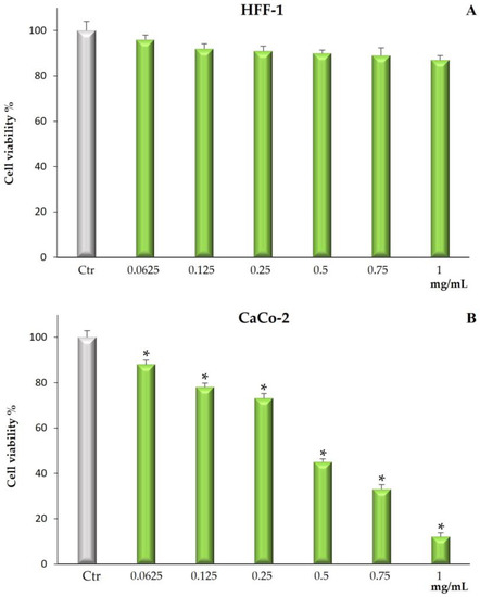 Cell viability in HFF-1 (A) and CaCo-2 (B) cells untreated and treated for 72 h with Bff-EAF at different concentrations (0.0625–1 mg/mL). Values are the mean ± SD of four experiments in triplicate. * Significant vs. untreated control cells: p < 0.001.