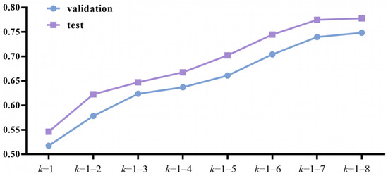 When utilizing k-mer to extract feature information from mRNA sequences, the value of k influenced the prediction accuracy significantly. Taking into account the computational complexity and computing power available, we performed many calculation experiments with various k value combinations to find the best k value. We tried k = 1; k = 1–2; k = 1–3; k = 1–4; k = 1–5; k = 1–6; k = 1–7; and k = 1–8. The results showed that as the k value continued to increase, the prediction accuracy of the model also continued to increase (Figure 2). However, as k increased, so did the dimensionality of the input data. Due to computing power constraints, we limited the maximum value of k to 8, and obtained k-mer data with k ranging from 1 to 8.