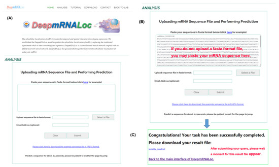 To facilitate the use of our model for mRNA subcellular localization predictions by biomedical researchers, a trained model was deployed on a web server, which can be publicly accessed at http://www.peng-lab.org:8080/mRNA/ (accessed on 10 February 2023) (Figure 3A). Users can upload their sequence file in fasta format to the server or paste the sequence directly into the text box on the server interface (Figure 3B). The mRNA sequence submitted to the web server must be in fasta format, with the base characters of G, C, A, and T. Each query sequence must be at least 100 bp long. If the submitted sequence does not conform to the fasta format, the web server will notify the user with the message “your file did not pass the format check” and request the user to resubmit the sequence in the proper format. After clicking the submit button, the page will navigate to a new page where the user can download the result file (Figure 3C). If the user enters his email address (optional) in the text input box before submitting the query, the result file will be automatically emailed to the user.