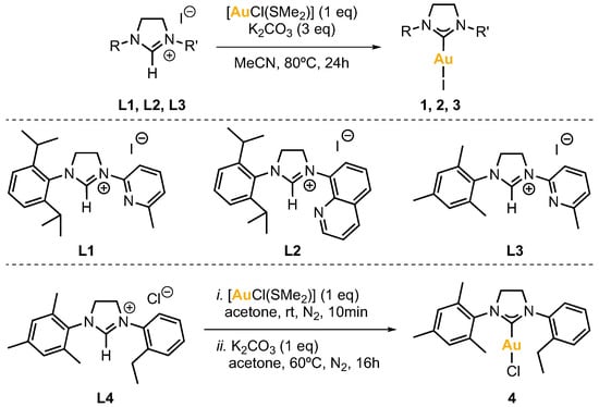 The synthesis of NHC-Au(I) complexes was based on previously reported works [26,27]. Complexes 1, 2 and 3 were obtained by reacting the corresponding imidazolinium salt L1, L2 or L3 (1 eq), chloro(dimethylsulfide)gold(I) (1 eq), and potassium carbonate (3 eq), in acetonitrile for 24 h at 80 °C. After this time, the reaction mixture was filtered over Celite® and all volatiles were removed under vacuum. The product was purified by column chromatography. The fractions that contained the product were combined, and the solvent was removed under vacuum to afford the gold(I) complexes as solids. Complex 4 was obtained analogously from imidazolinium salt L4 (Figure 2).