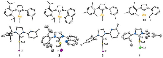 X-ray molecular structures of complexes 1, 2, 3 and 4 were obtained (Figure 3). In complexes 1–3, the pendant coordinating arm did not show any interaction with the metal center, and the linear coordination for the Au(I) center was confirmed in all cases, since the angle formed between the carbenic carbon, the gold center and the halide atom was close to 180° (for 1, 177.4(4)°; for 2, 175.4(2)°; for 3, 178.38(8)°; for 4, 179.12(16)°). No H-bonding network was observed with the non-coordinating pendant groups.