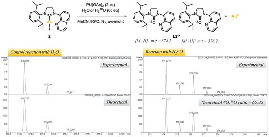 The origin of the O-atom in azolones was investigated by reacting complex 2, with PhI(OAc)2 as the oxidant and water as the additive, under nitrogen atmosphere (Table 1, entries 22,23, and Figure 4). In order to track the origin of the O-atom, a control reaction was carried out using distilled H2O, and another using 97% labeled 18O-water (see Supporting Material, Section S6). The reaction crudes were analyzed by ESI-HRMS. For the control experiment, a major peak at m/z = 374.2 was obtained, corresponding to the NHC=16O azolone L2ox, whereas for the reaction with H218O two major peaks were obtained at m/z = 374.2 and m/z = 376.2, corresponding to the NHC=16O and NHC=18O azolones L2ox, respectively. According to the isotopic pattern of such peaks, a 35% of 18O incorporation was obtained, suggesting that the O-atom in the azolones obtained in the reaction outcomes may come from adventitious water. The low 18O incorporation from water suggests that an oxygen-transferring mechanism may exist, and that at some point of the mechanism, water might react with the oxidant to deliver a 18O-labeled reactive intermediate. Further investigations would be needed to elucidate the mechanism; at this stage, the alternative possibility of considering acetate to be the O-atom source cannot be ruled out [38].