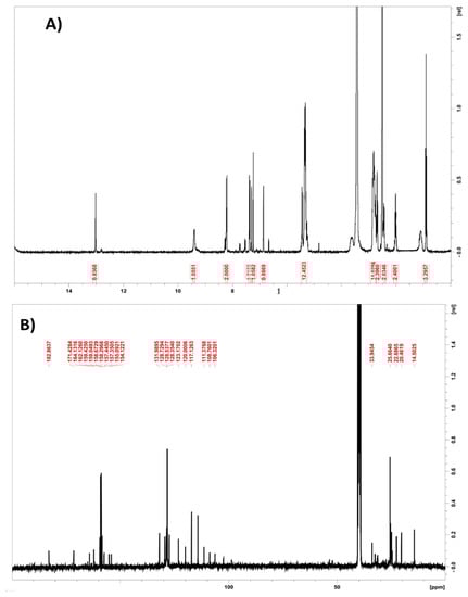 (A,B) 1H and 13C NMR spectrum, respectively, of 4′−DHA−apigenin in DMSO−d6 (θ = 25 °C) (C,D) HRMS spectrum and chromatogram of 4′−DHA-apigenin; m/z 579.27.