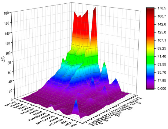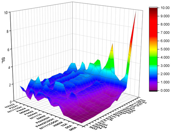 where and represent the infinite dilution activity coefficients of DMC and methanol in ILs, respectively. S stands for selectivity, which reflects the ability of ILs to extract methanol from DMC. The higher the value of S, the better the extraction separation effect. When S = 1, which means = , IL cannot be used for extraction. SP stands for the solvent solubility property, and the higher the value is, the better the solubility of the IL to methanol is. SL stands for solvent loss, which reflects the loss of DMC after extraction. The higher the value is, the greater the loss.