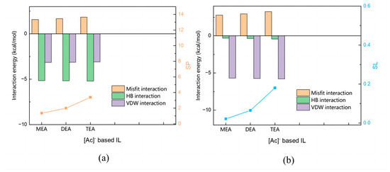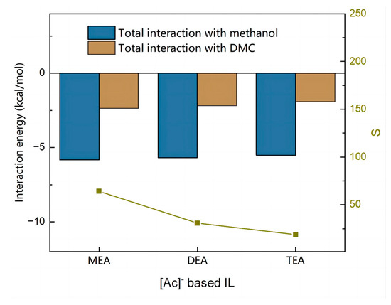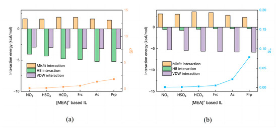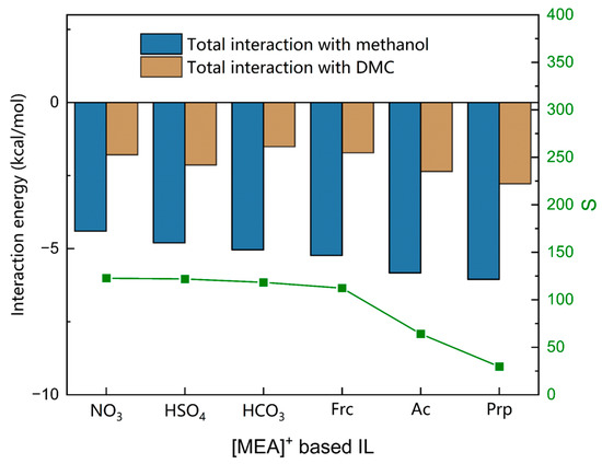 The molecular interactions of ILs composed of [MEA]+ and six anions on methanol and DMC were investigated, and are shown in Figure 5 and Figure 6. From Figure 5 we can see that the total interaction between ILs and methanol was much greater than that between ILs and DMC, which is necessary for the effective separation of methanol from DMC. Figure 6a shows that the molecular interaction between methanol and ILs is mainly hydrogen bonding. With the enhancement of acid radical ion acidity, the hydrogen bonding force gradually increases, resulting in a slightly increasing SP value. Figure 6b shows that the dominant molecular interaction between DMC and ILs is the VDW interaction. With the enhancement of acid radical ion acidity, the VDW interaction gradually increases, which leads to a significant increase in the SL value, resulting in a decrease in the S value. The S value follows the order: [MEA][NO3] > [MEA][HSO4] > [MEA][HCO3] > [MEA][Frc] > [MEA][Ac] > [MEA][Prp].