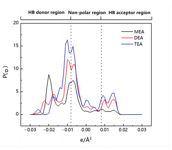 One of the most significant molecule-specific characteristics in COSMO-RS theory is the σ-profile, which is often divided into three regions: the nonpolar region (−0.0082 e/Å2 < σ < 0.0082 e/Å2), the hydrogen bond acceptor (HBA) region (s > 0.0082 e/Å2), and the hydrogen bond donor (HBD) region (s < −0.0082 e/Å2) [23]. The impacts of the cation and anion species on the effectiveness of IL extraction were investigated by σ-profiles and molecular interactions.