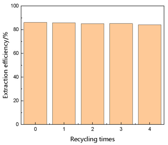 In the extraction experiment, the recycling of the extractant is also an important aspect. It is necessary to regenerate and recycle ILs from the mixture of methanol, DMC and ILs. After extraction, IL was regenerated from the IL phase by vacuum evaporation in 343.15 K for 5 h. Taking [MEA][Ac] as an example, using recycled [MEA][Ac] each time, we carried out extraction experiments under the same conditions four times. As shown in Figure 11, after four cycles, the extraction efficiency of [MEA][Ac] decreased slightly from 86.1% to 84.2%, proving the stability and efficiency of [MEA][Ac]. The fresh and recycled [MEA][Ac] were then analyzed by 1H NMR, and the results are shown in Figure S6. The results showed that the 1H NMR spectra of fresh and recycled ILs did not change, indicating that the structure of recycled ILs did not change.