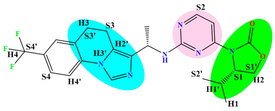 The steric (S and S′) and hydrophobic (H and H′) modification of favorable and non-favorable functional points in reference compound (RC-01). The green represents the oxazolidine moiety, pink represents the pyrimidine moiety, and cyan represents the imidazole moiety.