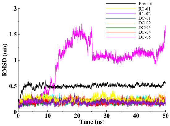 Molecular dynamics (MD) simulation is the foremost method used and it creates a paradigm in computer-assisted drug discovery pathways to conclude if the designed compounds are biologically active or inactive. The fundamental principle of MD simulation is to analyze the physical movement of atoms in the molecule by using intermolecular interactions under dynamic conditions over a time period to provide abundant information such as enzymatic favorable reactions, chemical pathways, thermodynamic and kinetic stability, and so on. For the flair drug discovery identification, the designed compounds must fulfill all the conditions in the MD simulation study which allow interaction with its target protein under the biological condition over a period to achieve results confirming whether the specific compound is biologically stable or unstable [50]. The selected designed compounds DC (01 to 05) and reference compounds are further subjected to an MD-simulation study [51] to identify the stability of the receptor–ligand complex in the biological environment. The results depict the ligand stability through the root-mean-square deviation (RMSD), root-mean-square fluctuation (RMSF), the radius of gyration (Rg), and hydrogen bond (HB) plots, which all state that the designed compounds have better stability for 50 ns compared to the reference compounds.