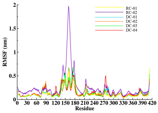 The inherent fluctuation of the receptor–ligand is frequently linked to its function. The residue-wise protein fluctuation factor is determined, which is directly related to the biological function of the specific ligand. In Figure 5, the overall RMSF value of the designed compound DC-01 shows a slightly high fluctuation in two specific regions (140–180 and 280–290) compared to the reference compound RC-01. Whereas, DC-02 shows identical fluctuation compared to RC-01, except it is in a different region (70–90). The overall RMSF value of DC-03 was considerably high in the zones of 70–90, 140–150, and 160–180 as compared to the RC-01. Similarly, DC-04 also shows an acceptable high fluctuation in specific regions (70–90, 110–120, and 270–280) as compared to the RC-01 where the average RMSF value of the RC-02 is highest among all the complex systems. This indicates that all of the designed compounds (DC-01 to DC-04) have comparable stability to the reference compounds RC-01 and RC-02.