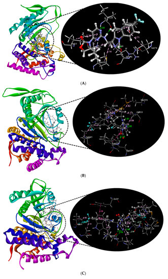 Figure 8 shows the final frame (50 ns) of receptor–ligand interaction after the MD simulation using the Groningen Machine for Chemical Simulation (GROMACS v2022.4) package [51]. The 2D representation of receptor–ligand interaction after the MD simulation at the final frame (50 ns) is shown in Figure S2A–F in Supplementary Materials.