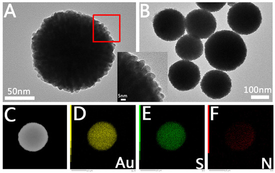 We carried out further structural characterization of Au NCs with different porous structures. The transmission electron microscope (TEM) image of the Au NCs with a microporous structure is shown in Figure 2. Figure 2A is a TEM image of a single microporous Au NC. We can see that the overall morphology is spherical and assembled from Au rods, similar to the dandelion structure. The inset is a magnified view of the part in the red box in Figure 2A; we can see that the size of each Au rod is approximately 7 nm, and the spacing of the Au condition is approximately 0.8 nm. From Figure 2B, we can see that its size ranges from 120–200 nm. Figure 2C–F shows the energy spectrum of Au NCs with a microporous structure. From the figure, we can clearly see that Au NCs with a microporous structure are mainly composed of Au elements, while a small number of S and N elements are distributed on the surface, indicating that GTH is dispersed on the prepared Au NCs.