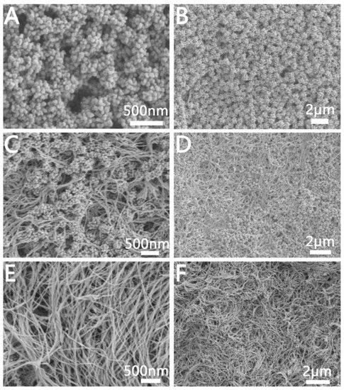 The reaction temperature often plays a decisive role in the reaction rate. Therefore, we changed the reaction temperature to explore its influence on the growth of Au NCs. Figure 6 shows the SEM of Au NCs prepared at a reaction temperature of 80 °C. Based on the reaction conditions for the preparation of mesoporous Au NCs, the reaction temperature was adjusted from 25 °C to 80 °C. The SEM images of the Au NCs prepared by us are shown in Figure 6A,B. Its structure is a hierarchical porous structure consistent with the Au NCs shown in Figure 4. When keeping the reaction temperature at 80 °C and increasing the amount of GTH from 50 μL to 150 μL, we will prepare well-divided porous-structured Au NCs and wire-like structures (Figure 6C,D). A further increase in the amount of GTH to 250 μL at a reaction temperature of 80 °C will prepare linear Au, as shown in Figure 6E,F. The diameter of the strips of Au is approximately 30 nm. We reasoned that increasing the reaction temperature not only accelerated the reaction rate but also changed the way GTH was assembled. At lower concentrations of GTH, GTH molecules would be inserted into the micelles formed by C16TAB, and intermolecular hydrogen bonds form a folded structure, thus forming a hierarchical porous structure after in situ reduction of Au ions (Figure 6A). With the increase in GTH concentration, more GTH molecules were connected end-to-end through intermolecular hydrogen bonds to form a linear structure, and a thin strip structure was formed after the in-situ reduction of Au ions (Figure 6E).