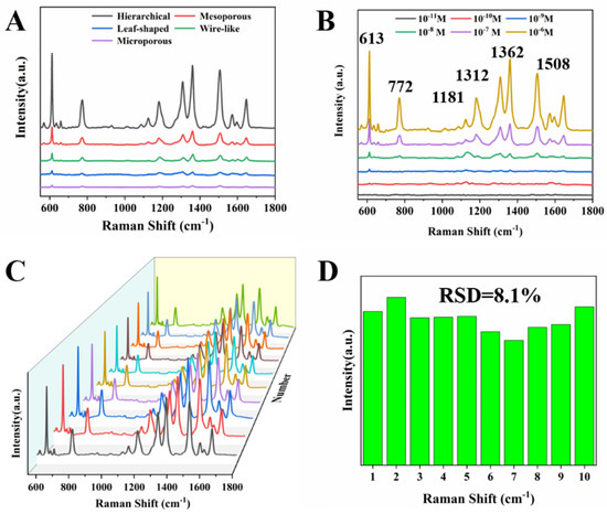 (A) Au NCs with different structures were used as SERS substrates to detect 10−5 M R6G. (B) The hierarchical porous Au NCs were used as SERS substrates to detect different concentrations R6G. (C) SERS spectra of 10 different points of R6G. (D) Graphs of the intensity of the peaks at 613 cm−1 from 10 SERS spectra.