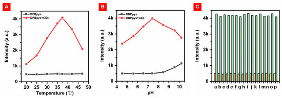 In order to test whether DBPpys can be used for the detection of CEs in a biological environment, the performance of DBPpys in reaction with CEs under different temperatures and pH conditions was investigated. The probe DBPpys showed almost no fluorescence in the absence of CEs, and the fluorescence intensity of DBPpys increased with the addition of CEs under normal human body temperature and pH conditions (as shown in Figure 3A,B). More importantly, the NIR fluorescence emission was significantly enhanced with the addition of CEs at 37.4 °C and pH = 7.4, close to the biological environment. This result indicates that the probe can be effectively detected in a physiological environment.