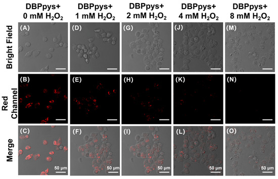 Fluorescent images of HeLa cells incubated with 10 μM DBPpys for 60 min after pretreating with different amounts of H2O2 for 2 h. H2O2 concentrations: (A–C) 0 mM; (D–F) 1 mM; (G–I) 2 mM; (J–L) 4 mM; (M–O) 8 mM. (A,D,G,J,M) bright field; (B,E,H,K,N) red channel (650–750 nm); (C,F,I,L,O) merge image. λex = 550 nm. Scale bar = 50 μm.