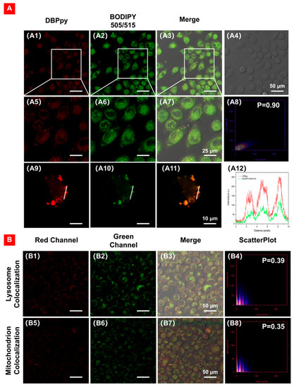 (A) CLSM of HeLa cells co-stained with (A1,A5,A9) DBPpy (10 μM, red channel), (A2,A6,A10) BODIPY 505/515 (5 µg·mL−1, green channel), (A3,A7,A11) overlay images of red channel, green channel and bright field, (A4) bright field, (A8) intensity correlation plot of BODIPY 505/515 and DBPpy, R = 0.90, and (A12) intensity profiles of ROI across a HeLa cell. λex: 550 nm; λem: 650–750 nm for DBPpy (red); λex: 490 nm; λem: 500–530 nm for commercial fluorophores (green). (B) Co–localization of DBPpy with lysosomes (B1–B4) and mitochondria (B5–B8).