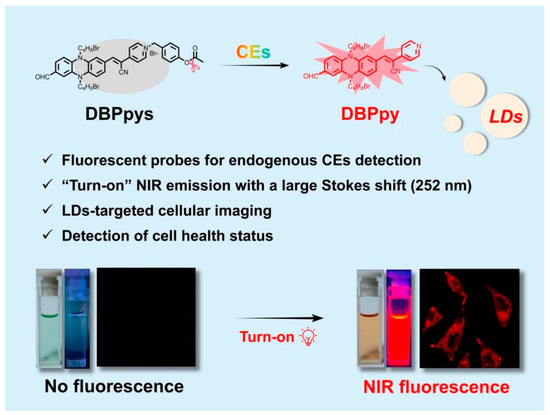 In this work, we designed a NIR fluorophore DBPpy with a large Stokes shift (over 250 nm) by constructing a D-A structure, which could specifically localize in LDs. By introducing 4-bromomethyl phenyl ester to DBPpy, the fluorescent probe DBPpys for CEs was developed, which showed a “turn on” NIR fluorescence signal and a distinct color change from green to brown with a low detection limit of 9.38 × 10−5 U/mL in vitro. Additionally, in the presence of other analytes, DBPpys showed specific recognition of CEs. Moreover, endogenous CEs activity is closely related to cell viability. Therefore, the probe DBPpys was successfully used to analyze the survival status of cells pretreated with H2O2 by detecting the differences in fluorescent intensity. These results provide a strategy for the development of additional NIR fluorescent probes for CEs activity monitoring and a potential tool for in vivo fluorescence imaging.