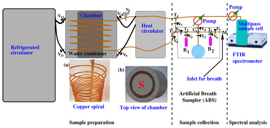 A schematic diagram of the experimental scheme for gaseous biofluid analysis by infrared spectroscopy. It consists of three major parts: (1) sample collection—in this part, breath or headspace of liquid biofluids is collected; (2) sample preparation—a water-suppressed sample is prepared for infrared spectroscopy when gaseous biofluids are passing through the “Water Condenser”; (3) spectral analysis—water suppressed gaseous sample is collected in a multipass gas cell and measured with an FTIR spectrometer. For details see the Ref. [74].