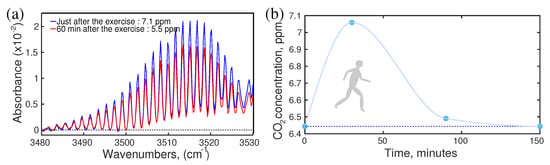 The effect of physical exercise. (a) Absorption spectra of breath CO. (b) The dynamics of CO concentration during and after jogging. (Ref. [17]).