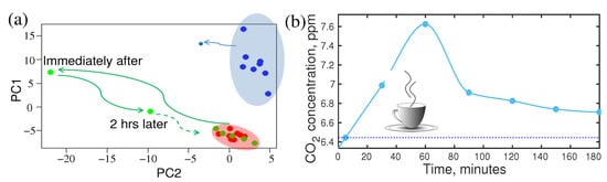In metabolism, foods, and drinks may have the strongest and instant influences [88,92,93,94,95,96]. Therefore, it is expected that a strong effect of foods and drinks would be observed in the breath VOCs. Of course, the change in metabolic concentration is mild in the case of regular food and drinks; however, a strong effect is observed in the case of a new type of food or drinks. There is a classic example of the coffee effect reported recently [17]. Two healthy volunteers of similar age, one is a moderate coffee drinker (>5 cups/day) and another volunteer drinks coffee occasionally (1 cup/two weeks), took part in the study. Both of them used the same kind of coffee and provided breath samples at regular intervals of time, starting from “just before” drinking the coffee and until three hours after the coffee intake. The experiment was performed and the results were compared without any attention to the individual’s physical state or previous meal intake. Infrared spectral data were analysed by component analysis as well as statistical analysis, e.g., principal component analysis (PCA). Results are presented in Figure 3a,b. A maximum concentration variation of metabolites was observed about an hour later than coffee intake. The concentration of metabolites gradually decreased and returned to its steady state. The maximum shift of the steady state point and its return to the steady state reflects the characteristics of the two volunteers. In the case of the rare coffee drinker, the shift is significantly high and it took much longer time to return to a steady state in comparison to the moderate coffee drinker. This observation is expected since coffee is an unknown chemical for the rare coffee drinker’s body and it reacts strongly. This information is crucial to establish an SOP for the metabolic analysis of biofluids.