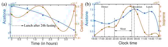 Fasting is not a regular human activity; however, it is a part of our life. Especially in the modern lifestyle, people often skip one or two meals in a day. Fasting has a strong influence on the metabolic profile of the person [95,96,97]. As a consequence of fasting, the concentration of acetone changes significantly. In a recent publication, a follow-up investigation of breath metabolites after fasting was reported [17]. The “after–effect” of 27 h of fasting was monitored for four hours. Many metabolites showed a significant shift in their concentration level due to fasting. For example, the variation of concentration of acetone and carbon monoxide were plotted in Figure 4a. After 24 h of fasting, the breath acetone level of a healthy person increased by approximately three times. At the end of fasting, the volunteer had a normal meal. The acetone level started to drop and still remain two times higher than the normal level after 4 h of the meal, whereas only 20% variation of acetone was observed in a circadian cycle. Therefore, it is extremely important to know the last food intake before collecting the biofluids, especially for diagnostic purposes. Otherwise, an abnormal change in acetone concentration may mislead the diagnosis.