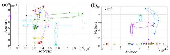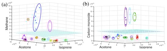 To date, discussed dynamics of metabolites are for a short time period, extended from hours to a single day only. What would be the behaviour of metabolites over a longer time period such as months or even years? In a recent investigation, several healthy volunteers took part in a longitudinal breath study by infrared spectroscopy. Several VOCs were monitored over a time period of eighteen months and observations were plotted in three-dimensional VOCs space in Figure 5a,b. For each individual, measured points in three-dimensional component space were enclosed by a circle, oval, or triangle. For eleven out of fourteen individuals, measured points were enclosed in a compact space and clearly separated from each other (see Figure 5a). This means, the individual’s breath content remained stable over the period of eighteen months and the overall recognition score of the individual was 100%, meaning the probability of unambiguously linking the non-assigned experimental point to one or another individual. For three individuals, the size of the enclosures was relatively large in methane–acetone–isoprene space (Figure 5a) and they were well apart from the other eleven individuals. It was observed that these three individuals shifted far away from other only in the methane axis. The individual points were also elongated in the methane axis. These three individuals were high methane emitters and their methane concentration varies over time [102]. Measured points for these three individuals in CO–acetone–isoprene (Figure 5b) space were compact in a small space; however, three smokers were separated out, who were compact in the previous case.