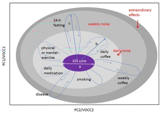 An illustration of the IOS concept for an individual. Any physiological parameters of the body can be presented on this graph. The space of representation can be blind (PC, canonical analysis) or show measurable variables such as VOC concentrations (VOCC) as its axes. Shown: the light grey area represents several daily factors affecting the IOS core and increasing thus the measurable IOS size; the medium grey area, factors affecting IOS on a weekly or monthly scale such as fasting or coffee intake for rare coffee drinkers; the dark grey area, extraordinary effects such as strong stress or disease. There are two main scales making the concept quantifiable: the core size a and the strength of the effect b, c, etc. In the case of VOCC representation, scale parameters a and b are reduced to n and n. The concept can be extended to many individuals. In this case, two other scales should be used: a and l, where l is the distance between the IOS cores. The higher the space dimensionality, the more cross sections can be found where any two persons will have l > a. (Ref. [17]).