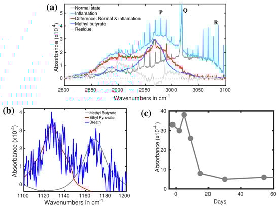 Apart from the detection of bacterial infection, understanding the population dynamics of microbiota helps to develop an efficient antibiotic treatment. The current knowledge on deviations of human microbiota caused by antibiotic treatment is substandard [131]. To improve it, deviation of breath VOCs of a volunteer under treatment of quadruple antibiotic course (QAC) against Helicobacter pylori has been studied by infrared spectroscopy [132]. Two spectral regions were identified where the corresponding spectral structures strongly deviate during the antibiotic treatment [132]. Both spectral features along with the time trace of one of them are shown in Figure 9a–c. The spectral feature of methane at around 3000 cm is strongly modified by some unknown spectral features. Using the digital subtraction method, a prominent spectral feature is revealed (see Figure 9b). This feature is well fitted with methyl butyrate absorption peak at around 2970 cm. A detailed of digital subtraction procedure is presented in a separate article [122]. Two other prominent spectral features are observed in Figure 9b. The spectra feature at around 1130 cm is fitted well with the absorption peak of ethyl pyruvate and peak at around 1170 cm is well fitted with methyl butyrate. Both the identified molecules generated by bacteria in the gut are involved in fundamental metabolic processes [107,133]. Therefore, both metabolites could be used for monitoring acute gastritis and anti-Helicobacter pylori treatment. The time trace of the absorption peak at 2970 cm is plotted in Figure 9c. During infection by Helicobacter pylori, the concentration of methyl butyrate is quite high. After the antibiotic treatment, the concentration drops relatively slowly and takes more than 10 days to return to its normal concentration. To the best of my knowledge, this is the first demonstration of the dynamics of breath VOCs for acute gastritis affected by the quadruple antibiotics course carried out by infrared spectroscopy. Therefore, it can be concluded that infrared spectroscopy is capable of identifying possible biomarkers for bacterial infection. Of course, it needs to be clarified with some other bacteria also. In an ongoing project, many bacteria are identified by analysing bacterial headspace by infrared spectroscopy.
