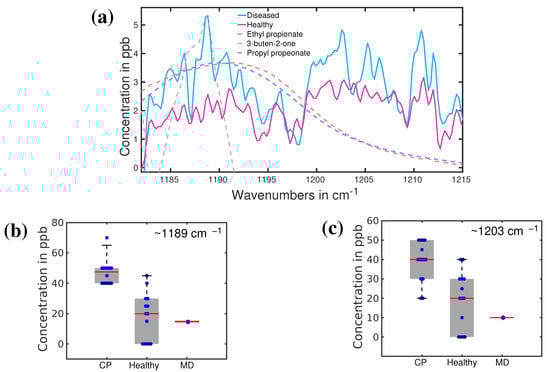 Recently another investigation was carried out to reveal possible biomarkers in the breath sample of a person with CP [140]. Infrared spectroscopy has been used to identify the VOCs associated with CP in exhaled breath. The infrared spectra of breath from 13 volunteers with CP were compared with 14 healthy volunteers of comparable ages. The average infrared spectra of CP and healthy cohorts are presented in Figure 10a. Infrared spectroscopy allowed us to identify two distinguishable spectral features for CP and healthy groups. These two spectral feature are observed around 1189 cm and 1205 cm. The least-square fitting procedure was performed to find out the possible molecules associated with these two spectral features. Ethyl propionate, propyl propionate, and 3-buten-2-one seem to fit quite well with the spectral feature around 1189 cm. The other peak is not yet resolved. Statistical analysis was performed on the spectral data in the range 1185–1215 cm using unsupervised principal component analysis (PCA analysis) and supervised Support Vector Machine (SVM) and Random Forest (RF) methods. The statistical results are presented in Figure 10b,c. More than 90% accuracy has been achieved in the identification of the two groups by using supervised analysis [141]. This is a significant result toward the development of the diagnosis of CP at an early stage. However, promising results demand additional studies, mostly focused on new specific biomarkers, larger statistics, and an extension of this investigation to newly born babies. All these three aspects are under investigation in an ongoing project.