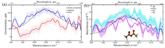 Prostate cancer may be the second most investigated cancer type for biomarkers search. In this regard, urine has been mostly investigated as biofluid as it is closely related to the prostate. Large metabolites in the liquid phase, as well as small metabolites (VOCs) in the gas phase from urine, are under investigation [106,150,151,152]. Prostate-specific antigen (PSA) test from the blood serum is one of the routine screening procedures for the detection of prostate cancer; however, the sensitivity and the specificity are significantly lower than the desired accuracy for cancer diagnosis [153,154]. Breath has been also considered a potential source of biomarkers for prostate cancer [155,156]. A little has been conducted to find out breath VOCs related to prostate cancer. Recently, an infrared spectroscopy-based VOCs analysis for prostate cancer demonstrated promising results. In this study, breath samples from a small cohort of 28 prostate cancer patients were analysed and compared with 19 healthy volunteers [157]. In addition, breath samples of eight kidney cancer and eight bladder cancer cases were also investigated to find out whether the infrared signatures of all these three cancers are different or not. Eight spectral regions were found where spectral signatures for different cohorts are distinguishable. One of the spectral signatures, centred around 1005 cm, is shown in Figure 11a for the healthy and prostate cancer cohorts. The average spectra of the healthy cohort are shown with a solid red line. A shaded red region depicts the spectral variation of each individual. Similarly, prostate cancer cohorts are shown with blue colour. Two cohorts are fully separated even without overlapping among their individuals. This allows for distinguishing prostate cancer cohorts from healthy cohorts with over 95% accuracy [158]. The three types of cancer under investigation are also distinguishable from each other; however, their separations are not prominent like in the previous case (see Figure 11b). The molecule associated with this spectral feature was identified by least-square fitting with reference molecular spectra from a commercial database. For this case, acetic anhydride is identified as one of the potential biomarkers for prostate cancer diagnosis. The identification was also verified by quantum chemistry calculations (see supplementary of reference [158]). In this study, seven more spectral features are identified for which healthy and prostate cancer cohorts are distinguished with accuracy over 90%. A detail of the spectral position, associated molecule, and calculated accuracy are presented in Table 1.