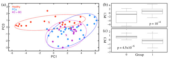(a) Statistical analysis using PCA method. Ellipses are shown for visualization, with the corresponding centres marked by “x”. (b,c) The box plots of statistical results. (Ref. [158]).