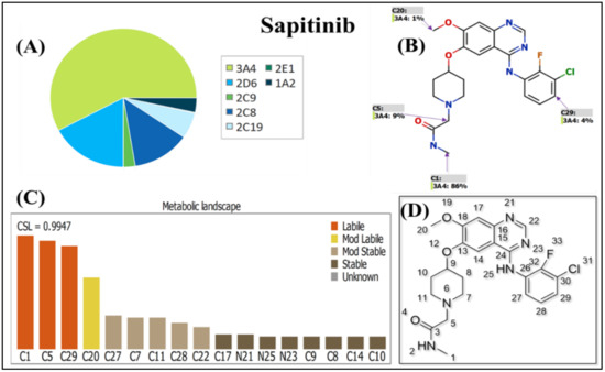 WhichP450 StarDrop software (Optibrium Ltd.; Cambridge, MA, USA) proposed the metabolism regioselectivity of the seven major drug-metabolizing isoforms of Cytochrome P450 enzymes (CYP3A4, CYP2D5, CYP1A2, CYP2C9, CYP2C8, CYP2C19, and CYP2E1). The results are represented as composite site lability (CSL) values indicating the target analyte (SPT) metabolic lability. CSL was considered an important parameter in predicting the metabolic rate of SPT before running the in vitro experiments to confirm the importance of the current work in order to save time and resources. The SPT (CNC(=O)CN1CCC(CC1)OC2=C(C=C3C(=C2)C(=NC=N3)NC4=C(C(=CC=C4)Cl)F)OC) SMILES format was attached to StarDrop software for CSL prediction. To assess the metabolic lability of SPT, the individual atom labilities were gathered to compute the CSL, revealing the overall metabolic stability for SPT [22,23,24] according to Equation (1):