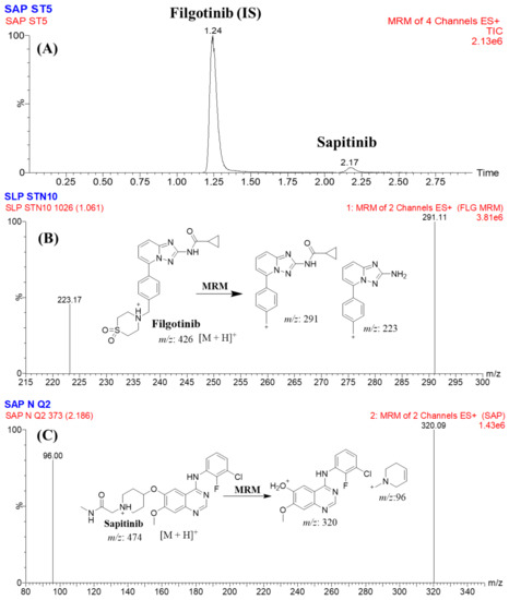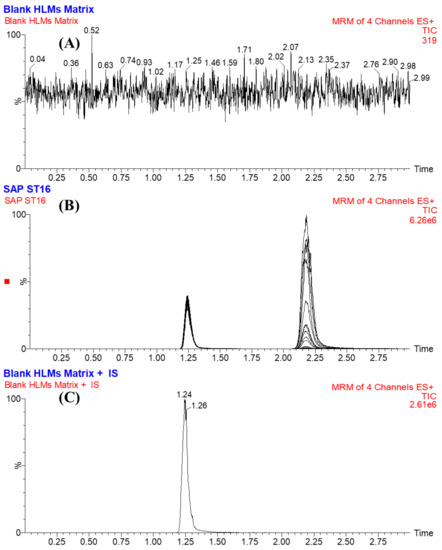 The specificity of the established method was approved by the good separation of the chromatographic peaks of STP and FGT, as shown in Figure 4. In addition, there were no interference with the chromatographic peaks of STP and FGT from the HLM matrix constituents (Figure 4A). No carryover effect of STP was seen in the control blank MRM chromatograms (Figure 4C).