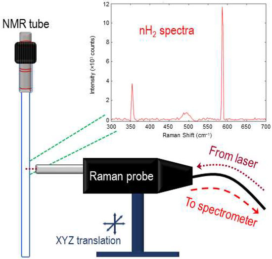 Although the recent interest in pH2 has focused on its ability to enhance the NMR signals of other molecules of interest [42], the different rotational levels occupied by the para and ortho spin isomers provide a convenient method of observing the pH2 enrichment level using Raman spectroscopy (H2 rotational constant is reported to be between 84.8 K and 87.6 K [7]). The integrals of the first-order transitions of the lower-energy pH2 Raman peak (e.g., 355 cm−1) and higher-energy oH2 peak (e.g., 586 cm−1) can be compared in real time to determine the relative abundances of the two spin isomers. This internal comparison mitigates the need for a reference standard to determine the enrichment of pH2 in the gas sample, and Raman spectroscopy is significantly faster than NMR detection of the gas (remembering that the pH2 fraction does not provide an MR signal and must be deduced from changes to the oH2 MR signal over time) [19]. Furthermore, Raman spectroscopy can probe the gas in situ while stored within a glass NMR tube, with minimal interference from the glass container. Raman spectroscopy has been used previously to interrogate parahydrogen systems [43] across a range of analysis conditions, including the use of Raman microscopes [34,44], specialized gas cells with relatively high pressures (e.g., 345 bar) [45,46], or long integration times (e.g., 20 min per scan) [47]. Parrott et al. recently reported in situ measurements of pH2 enrichments from a parahydrogen generator using an in-line flow tube and non-contact backscattered Raman collection at lower pressures (e.g., 4 bar) and short integration times (e.g., 30 s) [40]; their study focused on characterizing and optimizing the production of a newly constructed pH2 generator for MR applications.