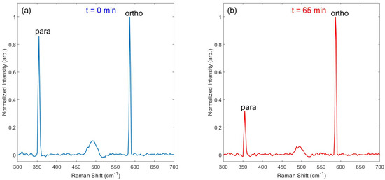 Example Raman spectra of the J: 0 → 2 ‘para’ spin peak (355 cm−1) and J: 1 → 3 ‘ortho’ spin peak (586 cm−1), taken both (a) immediately after loading the pH2-enriched gas into the valved NMR tube and (b) after 65 h had elapsed. The relative abundances of the two spin isomers can be determined from their relative peaks (e.g., the pH2 fraction is nearly 50% at t = 0 and reverts to the thermal equilibrium value of 25% within 65 h). See Supplemental Figure S2 for a version of this plot with the peaks overlaid, demonstrating consistent shift and linewidth between time points.
