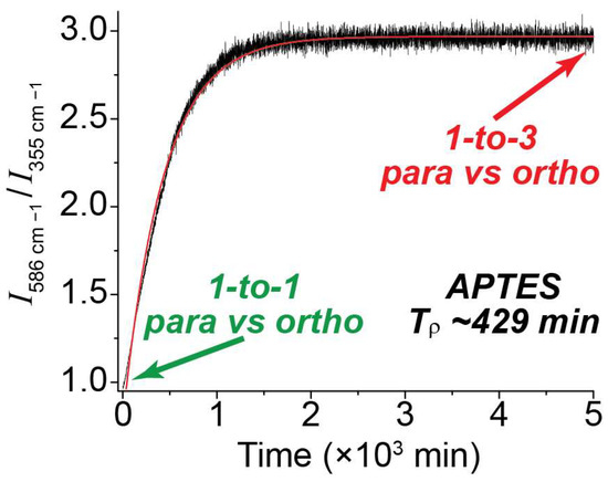Plot comparing the ratio of integrals for the 586 cm−1 peak (ortho) vs. the 355 cm−1 peak (para) over time in a valved NMR tube coated with APTES. The initial 1-to-1 ratio denotes a 50/50 mixture of para and ortho spins, which slowly equilibrates to a 1-to-3 ratio of para vs. ortho upon reconversion.