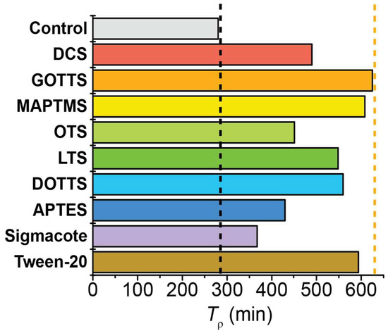 The Tρ values calculated for each surface chemistry are compared in Figure 6. The control case was a bare, untreated NMR tube; this tube exhibited a Tρ value of 280.2 min. The addition of surfactants resulted in variable increases to the Tρ values; this ranged from a 31% increase for Sigmacote to a 123% increase for GOTTS. Despite testing surfactants of varying length and branching, there was no overarching dependence of Tρ on the classification of surfactant. In general, the ‘medium length’ surfactants (~10 carbon atoms) exhibited the longest Tρ values, with 625.0 min for GOTTS and 608.1 min for MAPTMS. However, the next several surfactants that provided the longest pH2 Tρ values were of varying classification: Tween-20 (long, non-silane; 593.5 min), DOTTS (medium, branched; 559.4 min), and LTS (long; 548.4 min). The four surfactants with the least effect on Tρ were DCS (short; 489.6 min), OTS (long; 450.8 min), APTES (short; 429.4 min), and Sigmacote (proprietary; 367.3 min). Although these four surfactant choices were deemed as the least effective for maximizing Tρ, it should be noted that they still increased the pH2 lifetime by 31–75% compared with the uncoated NMR tube.