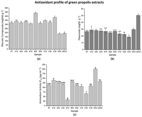 Antioxidant profile of green propolis extracts: (a) Determination of total phenolic compounds (mgGAE·g−1); (b) flavonoids (mgQE·g−1) and (c) antioxidant capacity to DPPH (IC50) of different green propolis extracts obtained by ethanolic (LPE) and supercritical extraction (SFE). Error bars represent the standard deviation (n = 3). Values presenting the same letter do not show significant differences (p > 0.05) in Tukey’s test at 95% confidence.