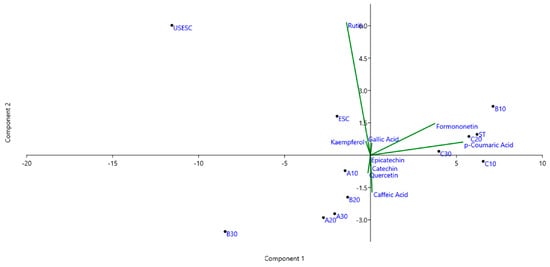 Conversely, on the opposite left side (positive and negative) are samples C10, C20 and C30, that, despite sonication, showed the lowest flavonoid contents (Figure 1b). This shows a trend of higher temperatures associated with a longer exposure time being able to affect flavonoid extraction. Observing the left side (upper), it was noted that the B20 treatment was the one that best represented the variable TPC along with C10 and C30 (Figure 2), since they obtained higher concentrations of these compounds (Figure 1a). On the right side (positive and negative) the ESC and UESC treatments are positioned. From this, it is possible to note a tendency that ethanol extraction associated with sonication favors the extraction of phenolic compounds.