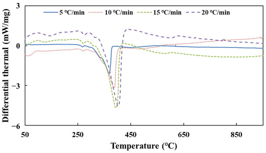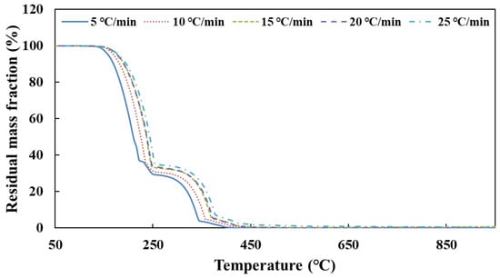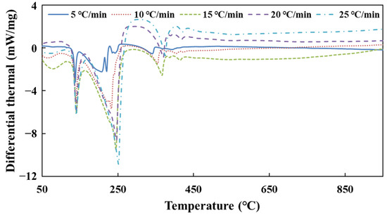 Each test sample was pulverized into powder form in an agate mortar, and about 10 mg of the sample was placed in an alumina crucible (3 mm in diameter). The purge gas in the heating furnace was Ar with a flow rate of 40 mL/min. The samples were heated from room temperature to 1000 °C at the heating rate of 2, 5, 10, 15, 20, and 25 °C/min.