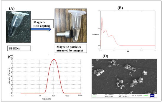 Characterizations of green synthesized SPIONs. (A) Green synthesized SPIONS using (-) EGCG showed magnetic properties in the presence of an externally applied magnetic field. (B) UV-visible absorption spectra of SPIONs in the UV-visible range (200–600 nm) showed maximum absorption (characteristic) peaks at 210, 236, and 278.5 nm. (C) Particle size distribution (hydrodynamic diameter) profile of SPIONs. (D) SEM image of SPIONs (scale bar 200 nm).