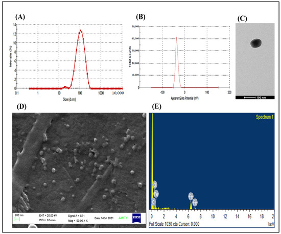 Characterizations of green synthesized TMX-conjugated BSA-coated SPIONs. (A) Particle size (hydrodynamic diameter) distribution profile of BSA-SPIONs-TMX. (B) Zeta potential distribution profile of BSA-SPIONs-TMX. (C) TEM image of BSA-SPIONs-TMX (scale bar 100 nm). (D) SEM image of BSA-SPIONs-TMX (scale bar 200 nm). (E) EDX analysis of BSA-SPIONs-TMX using SEM-EDX.